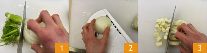 Para preparar a parmegiana de erva-doce, comece limpando as ervas-doces: remova a parte verde 1 e corte-as ao meio, depois fatie-as finamente com a mandolina para obter fatias muito finas e regulares 2. Corte a mussarela defumada primeiro em fatias e depois em cubos 3.