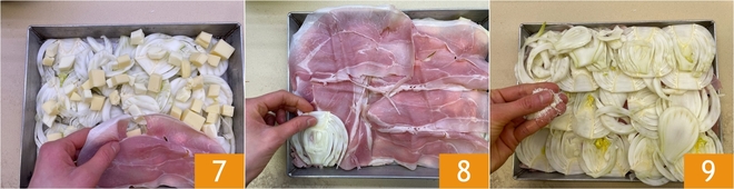 Adicione os cubos de mussarela defumada 7 e cubra com as fatias de presunto cozido formando uma camada compacta 8. Continue com uma segunda camada de erva-doce e finalize com mais queijo ralado 9.