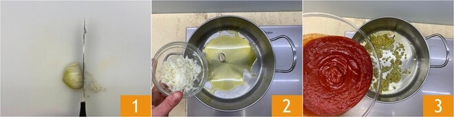 Para preparar a parmigiana de flores de abóbora, comece pelo molho: limpe e corte a cebola 1. Em uma panela, aqueça um fio de óleo, adicione a cebola 2 e refogue em fogo baixo. Uma vez que a cebola esteja amolecida, despeje o molho de tomate 3.