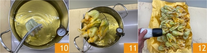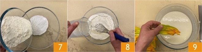 Prepare a massa: em uma tigela, coloque as duas farinhas 7, adicione a água com gás aos poucos 8 enquanto mexe com o batedor até obter uma massa lisa e sem grumos. Aqueça o óleo vegetal em uma panela, uma vez que atinja a temperatura de 170° para fritura, mergulhe primeiro as flores na massa 9.