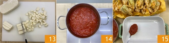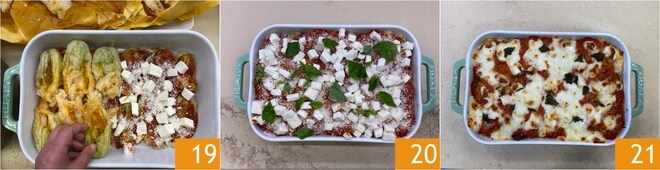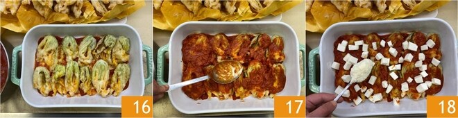 Coloque 1/3 das flores de abóbora fritas bem compactadas 16. Cubra com o molho de tomate 17, a mussarela, uma pitada de Parmigiano Reggiano 18, algumas folhas de manjericão rasgadas.