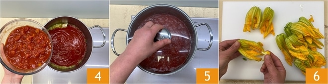 Adicione também a polpa 4, sal, pimenta, cubra com a tampa 5 e cozinhe até que o molho esteja espesso, levará cerca de 40 minutos. Enquanto isso, limpe as flores de abóbora 6, removendo o caule e o pedúnculo.