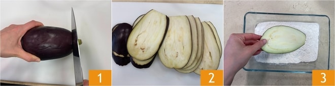 Para preparar a parmigiana do mar, comece pelas berinjelas: lave-as e retire o caule 1, depois corte-as em fatias finas, com cerca de 4-5 mm de espessura 2. Enquanto isso, aqueça o óleo de sementes em uma panela grande. Enfarinhe as berinjelas 3.