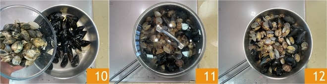 Adicione os Como limpar e abrir mexilhões e as amêijoas já limpas 10. Cubra com a tampa 11 e cozinhe em fogo alto até que as conchas abram 12.