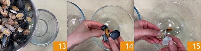 Uma vez prontos, escorra através de uma peneira 13, cuidando para reservar o líquido de cozimento 13. Retire as conchas dos mexilhões 14 e das amêijoas 15.