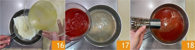 Coe o líquido de cozimento dos mexilhões e amêijoas e coloque-o em uma frigideira 16, depois leve-o à fervura e adicione o molho de tomate 17, sal e pimenta 18. Cozinhe por 20 minutos sem tampa.