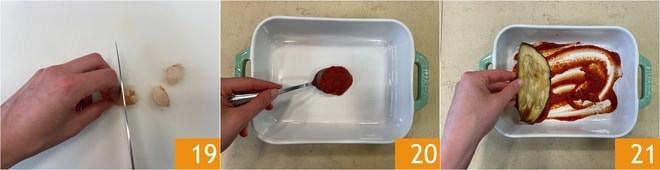 Pegue os camarões limpos e corte-os em pedaços 19. Tudo está pronto para montar a parmigiana: pegue uma assadeira de 25x18 cm, distribua no fundo uma primeira camada de molho 20, depois coloque as berinjelas fritas 21 e cubra novamente com o molho.