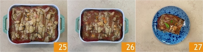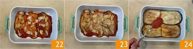 Continue com uma camada de mexilhões, amêijoas e camarões 22, depois polvilhe com a farofa de ervas 23. Continue com outra camada de berinjelas e molho 24 e alterne as camadas da mesma forma até os ingredientes acabarem.