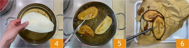 Quando o óleo atingir 170°C, mergulhe as fatias de berinjela enfarinhadas 4. Frite por alguns minutos até dourar 5, depois escorra em uma bandeja forrada com papel toalha 6.