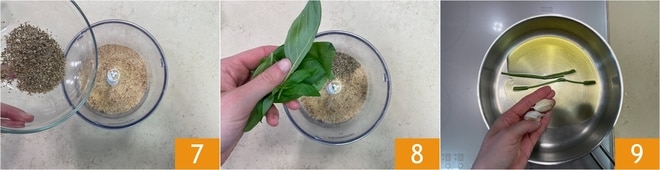 Agora prepare a farofa de ervas: coloque no liquidificador a farofa, o orégano 7 e as folhas de manjericão 8. Bata tudo junto e reserve. Passe para os moluscos: em uma frigideira, aqueça o óleo com o alho e os talos de salsinha 9. Deixe pegar sabor por alguns instantes.