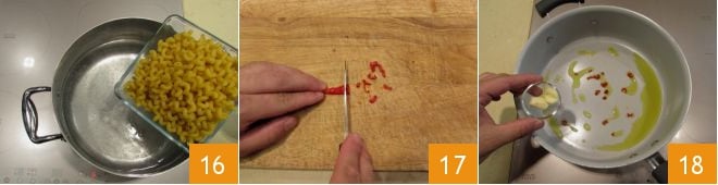 Cozinhe a massa em bastante água fervente, levemente salgada (uma vez que o molho será muito saboroso, graças à presença da ricota salgada) 16. Enquanto isso, corte uma pimenta fresca, retire as sementes e pique finamente 17. Coloque em uma panela o óleo junto com o alho, sem o miolo, e a pimenta 18 e deixe dourar em fogo moderado, depois retire o alho.