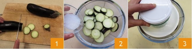 Para preparar a pasta alla Norma sem tomate, comece limpando as berinjelas. Lave as berinjelas, corte as pontas e fatie em pedaços de meio cm de espessura 1. Coloque-as em uma peneira, polvilhando-as aos poucos com o sal grosso 2. Cubra com um prato e coloque um peso por cima 3, e deixe as berinjelas de lado por 1-2 horas. Assim, elas vão liberar o excesso de líquido e o amargor.