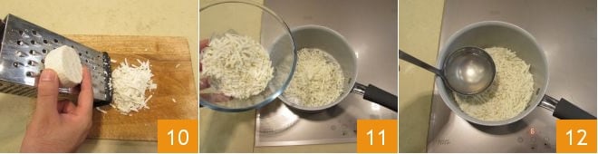 Agora dedique-se à preparação do creme de ricota salgada. Rale a ricota salgada 10 e reserve cerca de 50 g para a decoração final; coloque o restante em uma panela 11. Adicione uma concha de água quente 12,