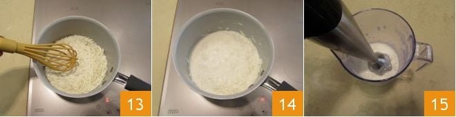 misture com um batedor 13 e cozinhe por cerca de 10 minutos, até que a ricota esteja derretida 14. Em seguida, coloque o creme de ricota salgada em um recipiente de bordas altas e bata com um mixer de imersão 15, até obter um molho liso e homogêneo.