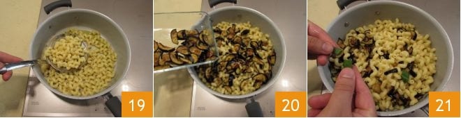 Escorra a massa al dente e adicione-a na panela com o óleo e a pimenta 19, acrescente também as tiras de berinjela 20 e as folhas de manjericão rasgadas à mão 21.