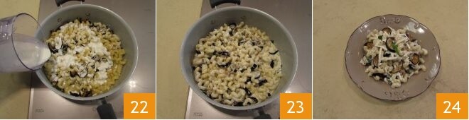 Adicione o creme de ricota salgada 22 e misture para incorporar todos os ingredientes 23. Sirva e decore sua pasta alla Norma sem tomate com lascas de ricota salgada reservadas e algumas folhinhas de manjericão 24.