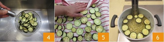 Passado esse tempo, enxágue-as em bastante água corrente 4 e seque-as com um pano de cozinha limpo e seco 5. Coloque o óleo de sementes em uma panela de bordas altas e aqueça a uma temperatura de 170° (use um termômetro de cozinha para atingir a temperatura certa) e coloque dentro poucas fatias de berinjela por vez 6, para não baixar a temperatura do óleo.
