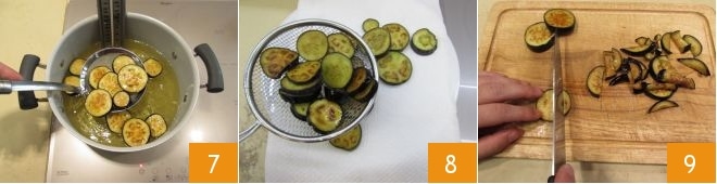 Frite as berinjelas até ficarem bem douradas, depois escorra com uma escumadeira 7 e coloque-as em uma bandeja forrada com papel absorvente 8. Depois de eliminar o excesso de óleo, corte as berinjelas fritas em tiras 9 e reserve.