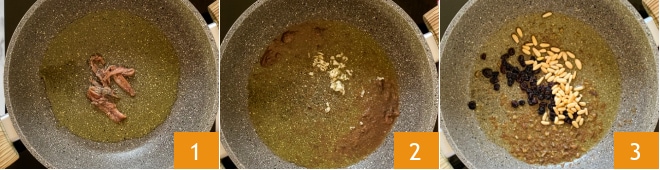 Para preparar o macarrão c'anciova, comece colocando as anchovas em uma frigideira com o óleo 1 e mexa frequentemente para que não se dissolvam completamente. Em seguida, adicione primeiro o alho picado finamente 2 e depois os pinhões e as passas 3, deixe apurar por alguns minutos.
