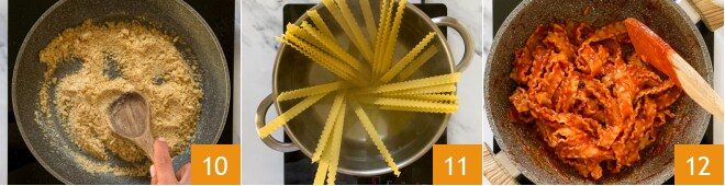 Adicione o óleo e uma pitada de sal e depois deixe torrar em fogo médio por cerca de 5 minutos, mexendo frequentemente para evitar que queime 10: deverá ficar com uma bela cor torrada. Neste ponto, salgue a água fervente e cozinhe o macarrão 11. Quando estiver al dente, escorra na panela para ajustar com o molho, misture 12 e sirva seu macarrão c'anciova com uma pitada de muddica atturrata e salsinha picada a gosto.