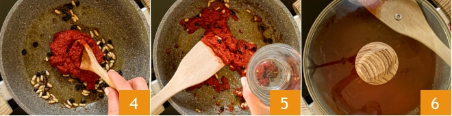 Neste ponto, adicione o extrato de tomate 4 e a água 5. Adicione sal, pimenta e uma pitada de açúcar, coloque a tampa e deixe cozinhar por 10 minutos em fogo baixo 6.