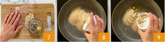 Enquanto isso, coloque a panela com água para o macarrão no fogo e também cuide da “muddica atturrata” (ou seja, da farinha de rosca torrada). Coloque as amêndoas em um saco e triture grosseiramente com um batedor de carne ou um peso 7. Despeje a farinha de rosca em uma frigideira antiaderente 8 e adicione as amêndoas trituradas 9.