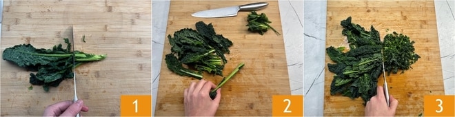 Para preparar a massa com couve negra, comece limpando a couve: depois de lavá-la, corte a base 1 e corte a parte mais dura e fibrosa do talo 2, sem necessariamente remover o restante do caule central, a menos que seja muito fibroso. Avalie folha por folha para reduzir o desperdício, removendo o caule apenas onde não estiver suficientemente tenro. Corte a couve limpa em tiras bem finas 3.