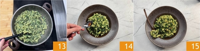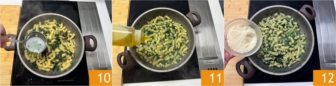 Misture bem e termine de cozinhar a massa com a água reservada 10. Se necessário, ajuste o sal. Por fim, com o fogo desligado, misture com um fio de azeite cru 11 e o pecorino ralado 12.