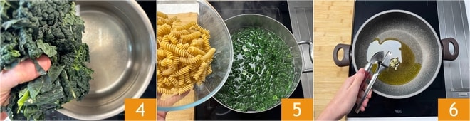 Mergulhe a couve em uma panela grande com água fervente salgada 4, que você já terá colocado no fogo para a massa. Aguarde alguns minutos para a retomada da fervura e adicione também a massa 5. Mexa e cozinhe por 2-3 minutos a menos do que o tempo indicado na embalagem. Enquanto isso, em uma frigideira grande, deixe o azeite aquecer suavemente com um dente de alho sem o miolo e amassado 6. O fogo deve estar bem baixo para que o óleo se aromatize sem que o alho escureça.