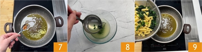 Adicione a pimenta seca 7 e mexa. Enquanto isso, retire 2-3 conchas generosas de água do cozimento e reserve em uma tigela 8. Escorra a massa com a couve e transfira para a frigideira com o refogado 9.
