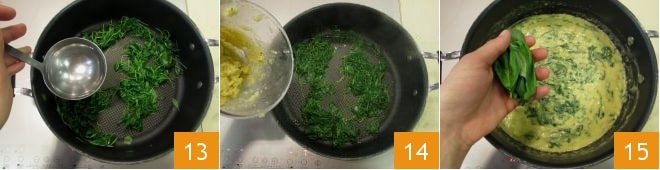 Deixe a rúcula murchar por alguns minutos, ajudando com uma concha de água do cozimento da massa 13. Uma vez murcha a rúcula, adicione o creme de grão-de-bico 14 e mais folhinhas de manjericão 15.