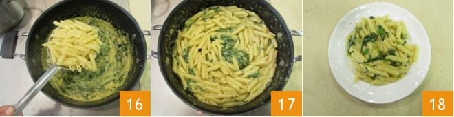Escorra a massa al dente diretamente na caçarola 16. Misture bem, mexendo por alguns instantes 17 e sirva sua massa com creme de grão-de-bico e rúcula bem quente 18, se preferir, com um fio de azeite cru e uma pitada de pimenta-do-reino a gosto.
