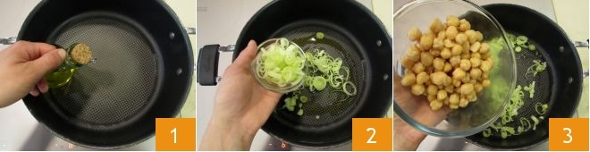 Para preparar a massa com creme de grão-de-bico e rúcula, coloque uma panela com água para ferver e, quando ferver, adicione sal. Passe para o creme de grão-de-bico: aqueça um fio de azeite em uma caçarola 1. Descasque o alho-poró e corte-o em rodelas finas; coloque-o na caçarola 2, depois escorra e adicione o grão-de-bico pré-cozido 3. Salgue a gosto e refogue tudo por cerca de 5 minutos, mexendo sempre.