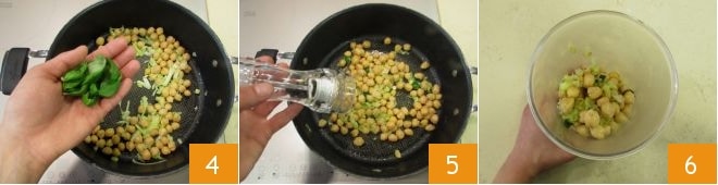 Uma vez que o alho-poró estiver macio, desligue o fogo e adicione as folhas de manjericão 4, misture e tempere com pimenta a gosto 5. Despeje o molho de grão-de-bico em um recipiente alto 6,