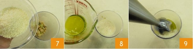 adicione o Parmesão ralado 7 junto com o azeite 8 e bata com um mixer de mão 9.