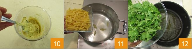 Para obter uma mistura suficientemente cremosa 10, se necessário, você pode adicionar uma ou duas colheres de sopa de água quente para diluir mais o creme durante o processo. Cozinhe a massa pelo tempo indicado na embalagem 11; enquanto isso, na mesma caçarola onde você cozinhou o grão-de-bico, adicione um fio de azeite e acrescente a rúcula 12.