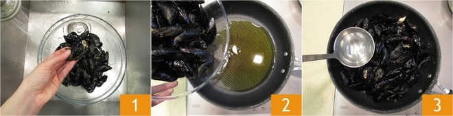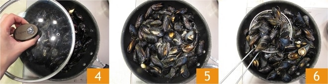 Cubra com uma tampa 4 e cozinhe até que todos os mexilhões estejam abertos 5. Usando uma escumadeira, levante os mexilhões 6.