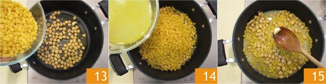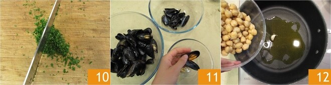 Pegue bastante salsinha e pique finamente 10. Agora, retire as cascas de todos os mexilhões 11. Em uma panela, despeje um fio de azeite e um dente de alho e deixe fritar por alguns minutos em fogo médio, adicione o grão-de-bico pré-cozido escorrido 12 e deixe dourar por cerca de 5 minutos.