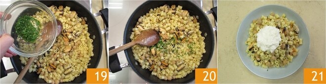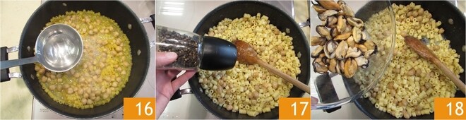 Deixe cozinhar em fogo médio até que a pasta esteja completamente cozida, tendo o cuidado de mexer frequentemente e adicionando, se necessário, algumas conchas de água 16. Ao final do cozimento, a pasta deve estar bem cremosa, mas não com caldo. Ajuste o sal e a pimenta 17. Agora adicione os mexilhões 18.