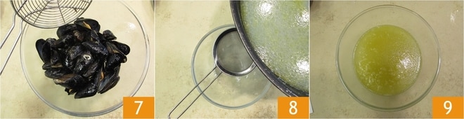 Transfira-os para uma tigela 7 e coe a água de cozimento 8, recolhendo-a em outra tigela 9.