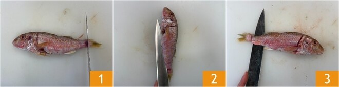 Para preparar a massa com peixes baratos, comece pela limpeza das tainhas: faça um corte com a faca sob a cabeça e acima da cauda 1, depois passe a lâmina sobre a espinha ao longo do ventre de ambos os lados 2 e, por fim, remova os filés obtidos 3. Faça o mesmo do outro lado. Certifique-se de que a cabeça e a cauda permaneçam presas à espinha central e reserve os resíduos que você usará posteriormente para o fundo.
