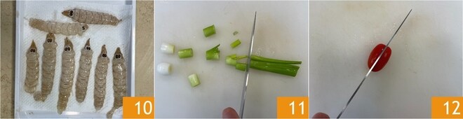 Extraia a polpa, tomando cuidado para deixá-la inteira 10, e reserve os resíduos. Agora você pode se dedicar ao fundo: limpe o cebolinho e corte-o em pedaços 11, depois divida os tomatinhos ao meio 12.