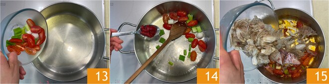 Em uma panela, despeje um fio de azeite, o cebolinho e os tomatinhos 13, depois adicione o extrato de tomate e toste em fogo alto por alguns minutos 14. Neste ponto, adicione os resíduos das tainhas e das tamarutacas que você reservou 15. Toste por mais 3-5 minutos em fogo alto, pressionando bem os resíduos com uma concha para liberar todos os sucos.