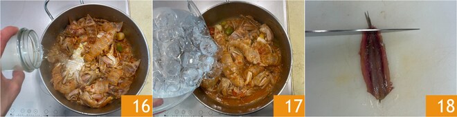 Quando começar a grudar no fundo da panela, deglaceie com o vinho branco 16 e raspe bem o fundo com a concha. Espere que a parte alcoólica evapore completamente, depois adicione gelo e água fria e abaixe o fogo: a redução da temperatura permitirá extrair os sabores da melhor forma 17. Deixe ferver em fogo baixo por cerca de 30 minutos, cuidando de remover a espuma que pode se formar na superfície devido a impurezas. Enquanto isso, cuide dos outros peixes, removendo as extremidades das sardinhas e das anchovas, já limpas e abertas como um livro 18.