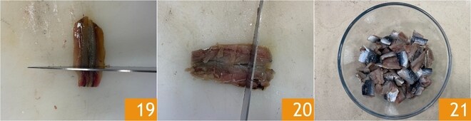 Corte as anchovas 19 e as sardinhas em pedaços do mesmo tamanho das tainhas 20 e reserve 21.