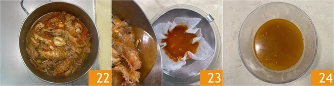 Após o tempo de cozimento do fundo 22, coe através de uma peneira forrada com um pano de papel molhado (ou gaze alimentar) para eliminar todos os resíduos 23. Reserve o fundo 24 e coloque uma panela com água para ferver para cozinhar a massa.