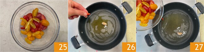 Para preparar o molho, corte os tomatinhos menores ao meio e os maiores em quartos 25. Em uma panela, refogue um dente de alho esmagado e uma pimenta com um fio de azeite 26, depois adicione os tomatinhos 27.