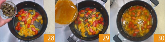 Doure em fogo alto, depois adicione as azeitonas 28. Quando os tomatinhos começarem a murchar, despeje o fundo 29 e continue cozinhando para reduzir ainda mais 30.