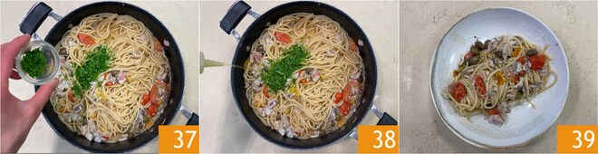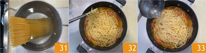 Enquanto isso, a água terá começado a ferver, então adicione sal e acrescente o espaguete 31. Escorra o espaguete 4 minutos antes do final do tempo de cozimento e transfira-o para a panela com o molho 32. Risoteie a massa na panela até terminar o cozimento, ajudando-se com uma concha de sua água 33.