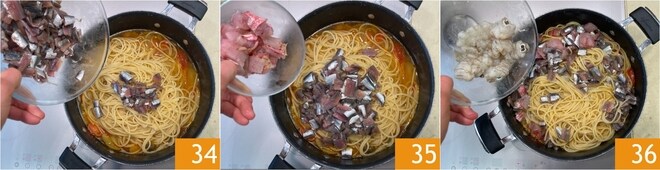Após alguns minutos, adicione as sardinhas, as anchovas 34 e as tainhas 35. No final do cozimento, adicione as tamarutacas, que cozinharão rapidamente 36.